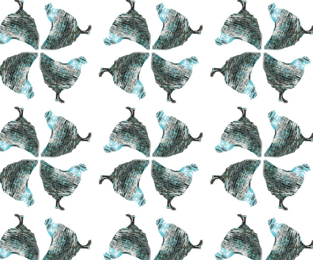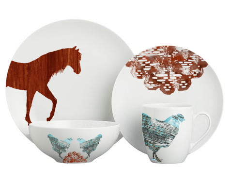 Design for set of tableware and linens with a rustic woodgrain theme.