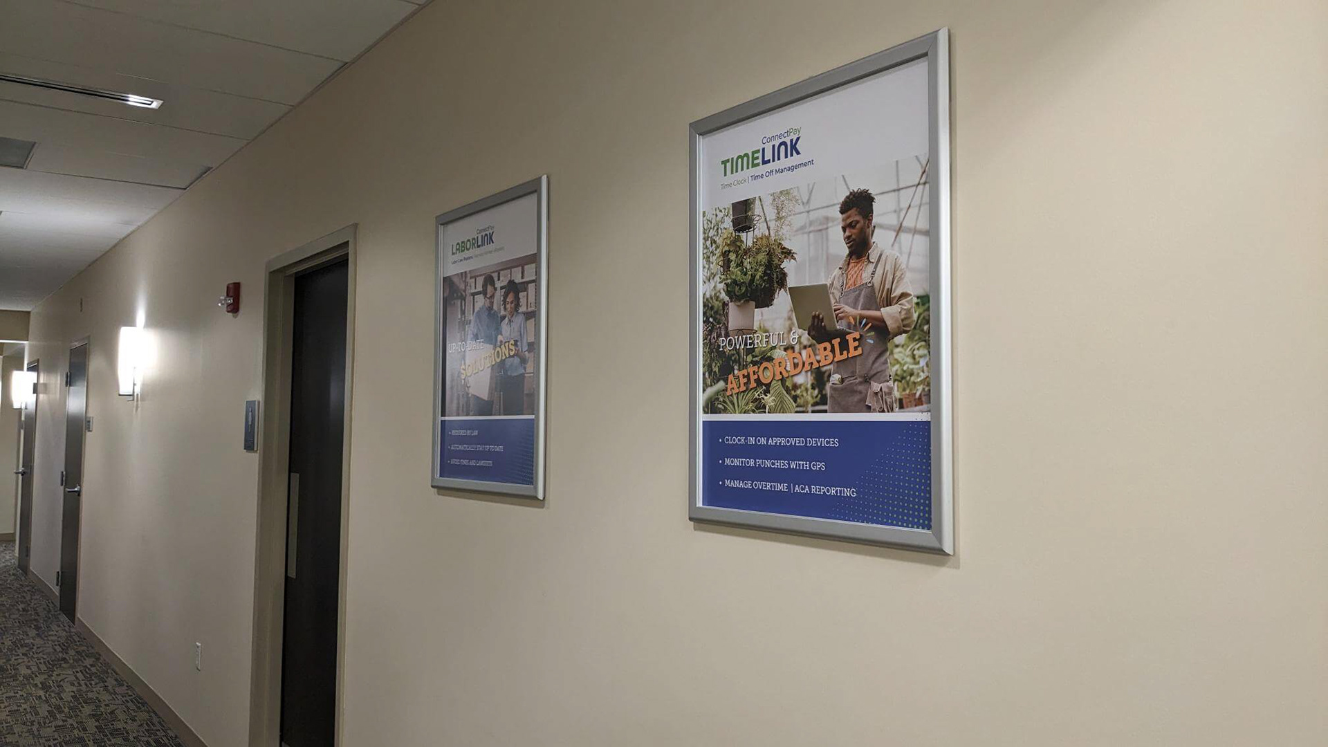 Reception areas for visitors, product posters, employee engagement and learning all fit within these spaces.
