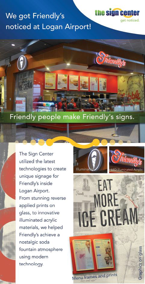 Friendly's used The Sign Center for design and printing of signage in it's refurbished storefronts. I was able to work on everything from measuring on site visits to choosing materials.